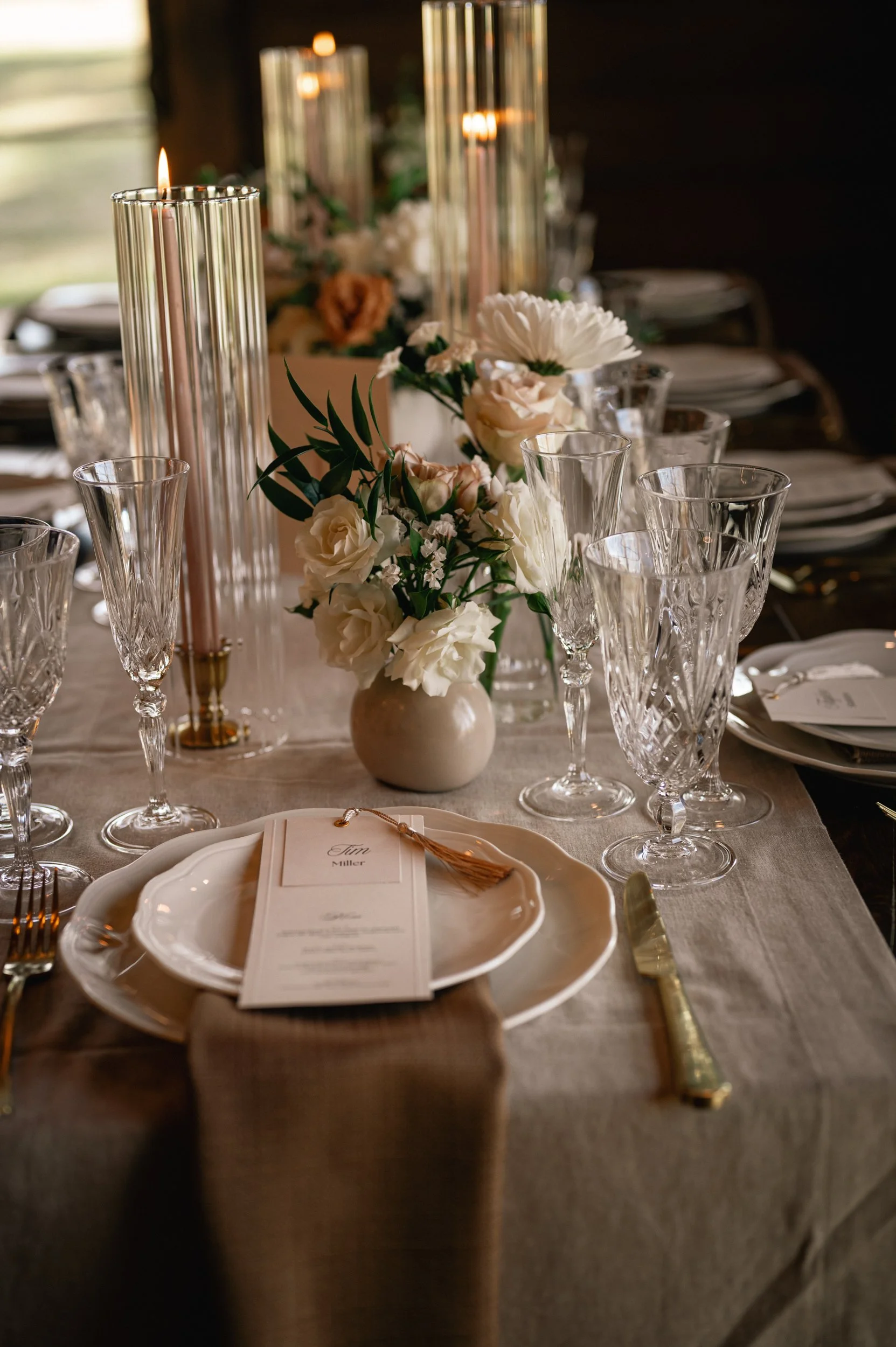 Candlelit dinner inside the historic barn, with cozy wooden tables, soft lighting, and the mountains as their backdrop.