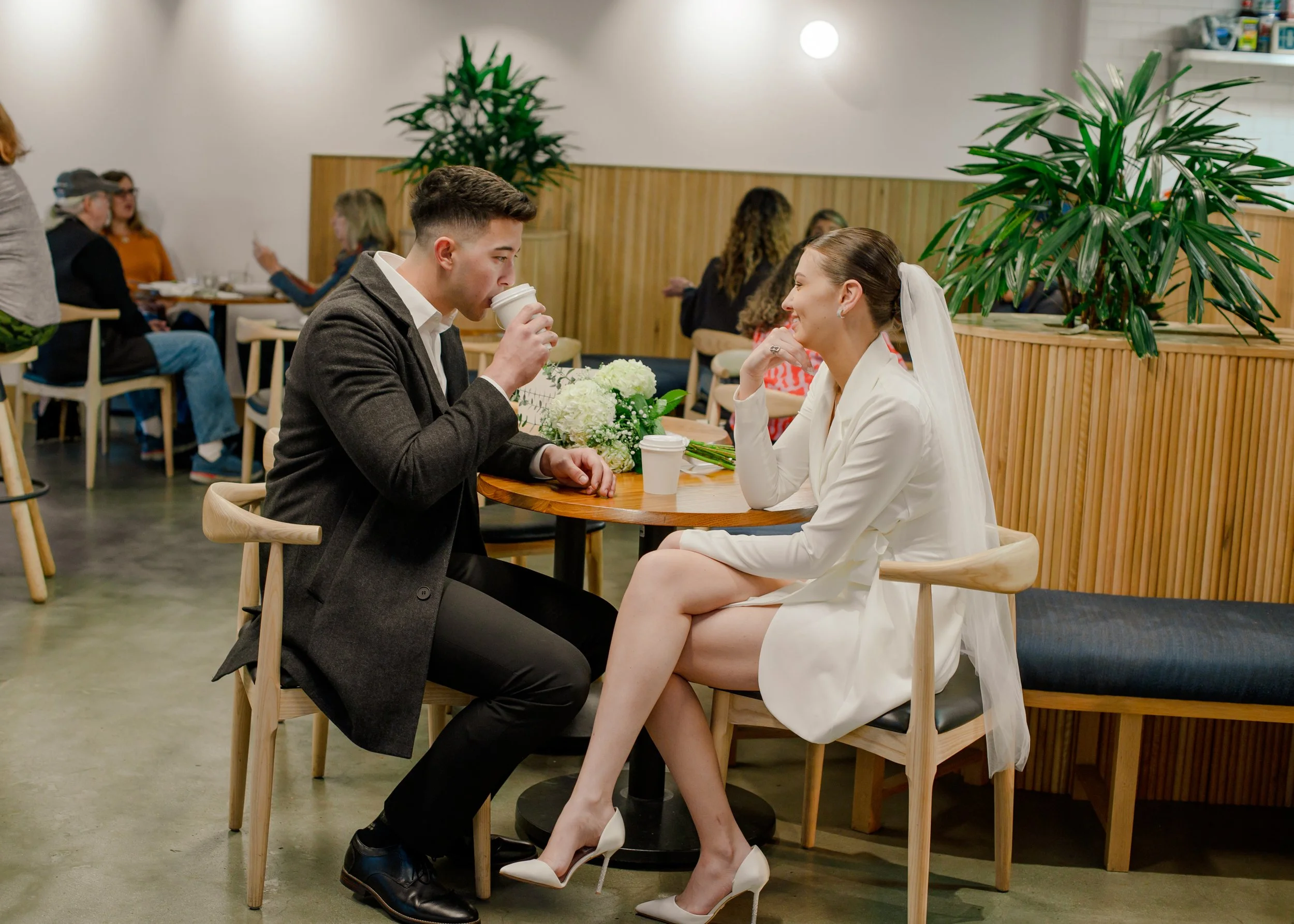 We hit Arcade Downtown for a warm coffee and tea, as it was a wet and nippy day. I always ensure the shops/stores are okay with photographing my couples before I start clicking away. Luckily for us, the staff are all super friendly, and they had zero issues with me snapping some photos for the newlyweds. They have the BEST coffee in Riverside. ( just saying) . So if you're ever in the area, be sure to make a stop for their delicious coffee, or their Avacado toast is delicious.
