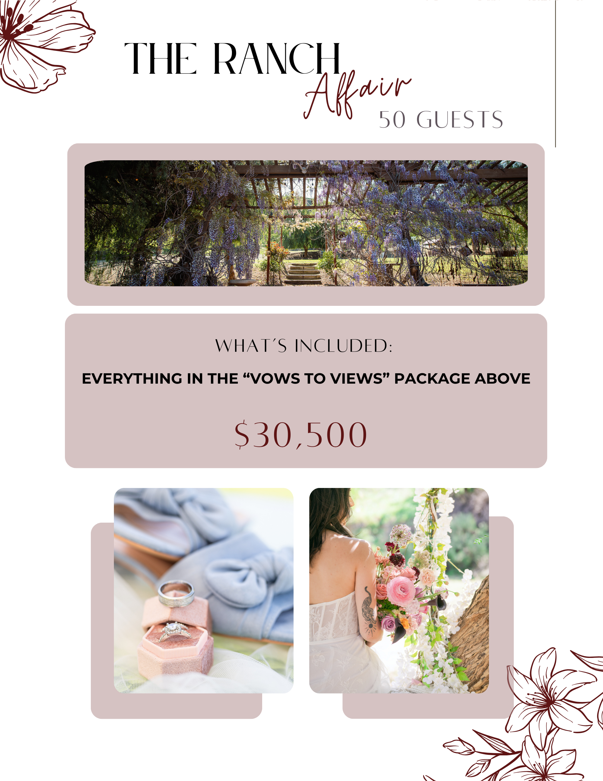 Once you have reserved your date and deposit with the venue, Rancho De Amor, we can start discussing your wedding day plans, color palettes, design, and vibes.
